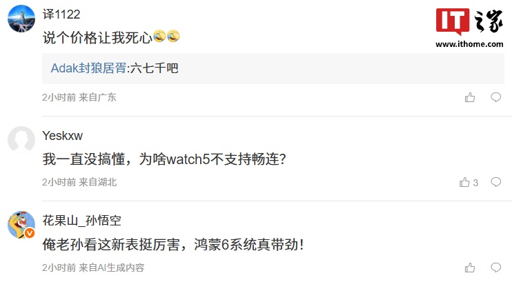有用户询问新款手表的价格,博主回复称:“六七千吧。”由此来看,华为 WATCH Ultimate 2 的预估售价区间为 6000~7000 元。参考海外版华为 WATCH Ultimate 2 定价为 799.99 英镑(IT之家注:现汇率约合 7438 元人民币)来看,该价格具备一定参考性。