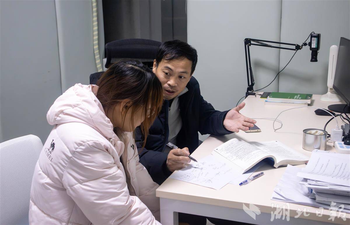 3月30日晚上,在华中农业大学襄阳书院自习室里,该校信息学院“锋哥有约”团队成员李淑华老师为几名学生进行数学答疑,一边画图示意,一边耐心拆解步骤,直到学生恍然大悟。