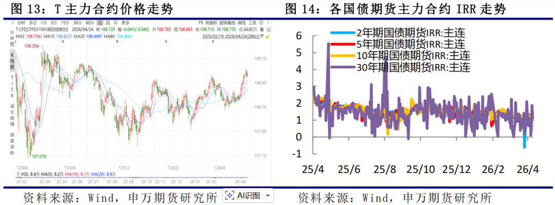 (4)基差结构:债券净融资额低位,从各机构持仓来看,本周T合约价格下跌,机构净多持仓涨跌不一,全市场日均成交量减少,持仓量增加。