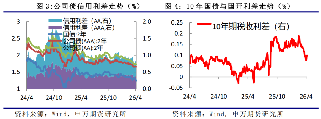 2、公司债信用利差普遍扩大。2年期AAA高等级公司债信用利差扩大4.34bp至41.57bp,2年期AA低等级公司债信用利差扩大4.55bp至48.99bp。国开与国债税收利差扩大。10年期国开债与国债收益率差扩大2.23bp至9.89bp。