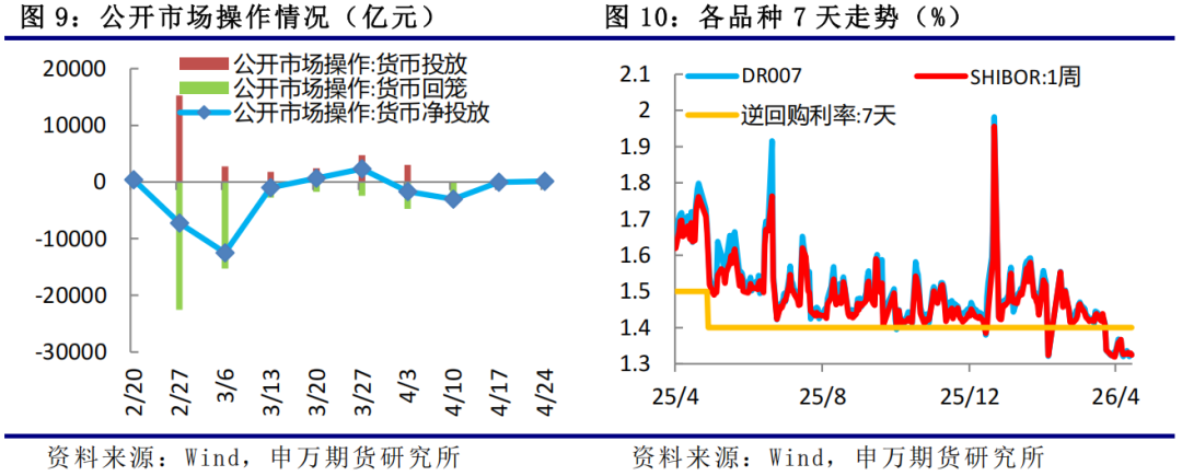 本周国债期货价格涨跌不一,央行公开市场逆回购小幅净投放,全额满足一级交易商需求,表明支持性货币政策立场的态度,LPR连续第11个月保持不变,Shibor隔夜利率持平至1.219%,市场资金面保持宽松。伊朗外交部表示谈判重心已从核问题转为彻底停战,美伊谈判陷入僵局,特朗普称不想仓促行事,已下令击沉任何在霍尔木兹海峡布雷的船只,局势再度升温,关注下一步进展。一季度GDP同比增长5.0%,环比增长1.3%,工业生产回升,消费持续改善,投资结构优化,房地产开发投资降幅收窄。