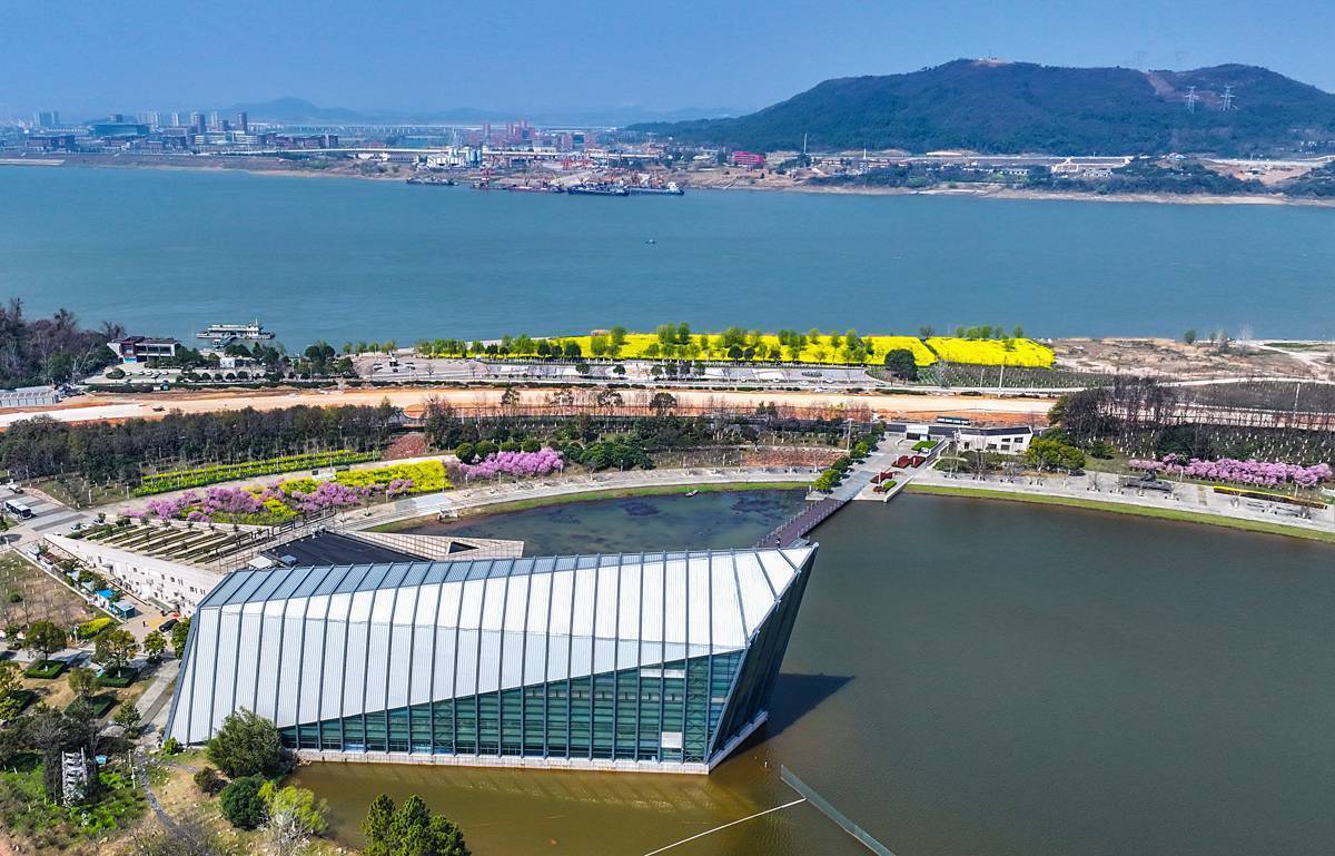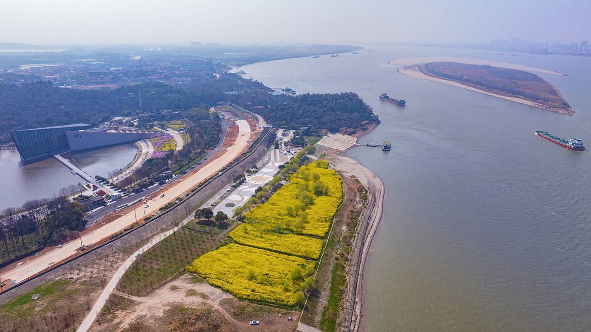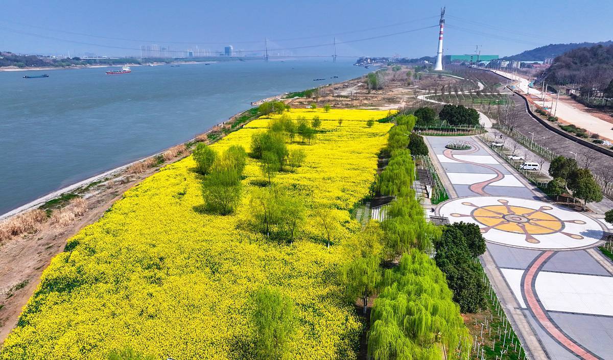 3月12日,鸟瞰中山舰博物馆油菜花海。花海面积约100亩,位于武汉市江夏区金口街中山舰路特一号的长江畔。近日,随着气温回暖,武汉的油菜花竞相绽放,金色的花海与青山绿水相映成趣,绘就一幅生机盎然的春日画卷。(湖北日报全媒记者 朱熙勇 摄)